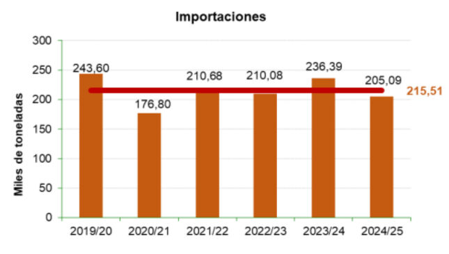 Αν και έντονα πλεονασματική η Ισπανία δεν «φοβάται» τις εισαγωγές, τις οποίες επιτρέπει. Αξιοσημείωτο ότι τη διετία της ελλειμματικής της παραγωγής οι ποσότητες των εισαγωγών δεν διέφεραν σημαντικά από τις «κανονικές» χρονιές.