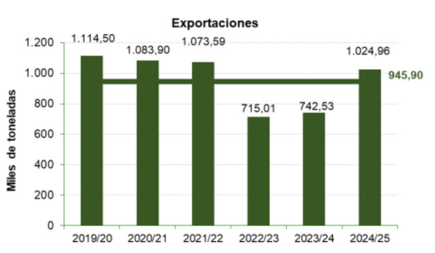 Όπως σημειώσαμε και στην παρουσίαση των στοιχείων της εσωτερικής κατανάλωσης αυτή, όπως και οι εξαγωγές, υπέστησαν μεγάλες μειώσεις την διετία 2022/24. Ωστόσο η περσινή (2024/25) ανάκαμψη δεν επάρκεσε ώστε να επανέλθει στο επίπεδο της 2021/22 με αποτέλεσμα η φετινή 2025/26 να αποτελεί ένα μεγάλο «στοίχημα» ώστε η τάση να ξαναγίνει ανοδική.