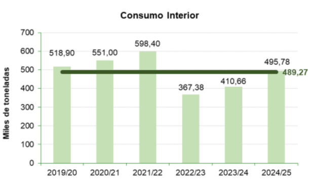 Την εξαετία 2019/20 – 2024/25 ο μέσος όρος του ισπανικού ισοζύγιου ελαιολάδου ήταν ο εξής (σε χιλ. τόνους):