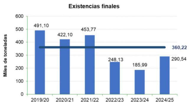 Τα αποθέματα τέλους έτους αν και τη διετία 2022/24 υπέστησαν την ανάλογη με την παραγωγή «καθίζηση», που συνεχίστηκε και την 2024/25, ωστόσο τελικά άντεξαν να «γεφυρώσουν» τις ελαιοκομικές περιόδους μεταξύ τους.