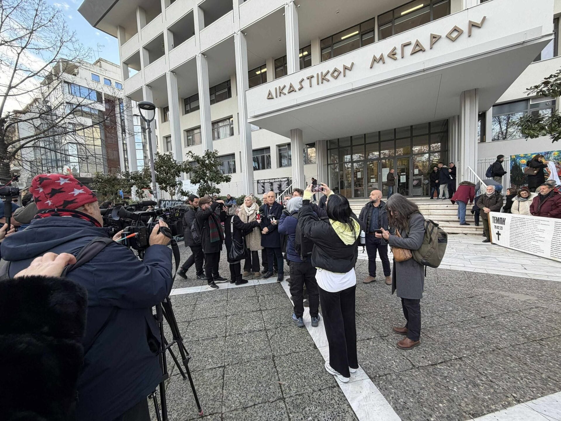 Έξω από τα δικαστήρια Λάρισας έχει συγκεντρωθεί πλήθος κόσμου, ενώ κάποιοι από τους συγκεντρωμένους κρατούν πανό που γράφει «Ήταν έγκλημα!».