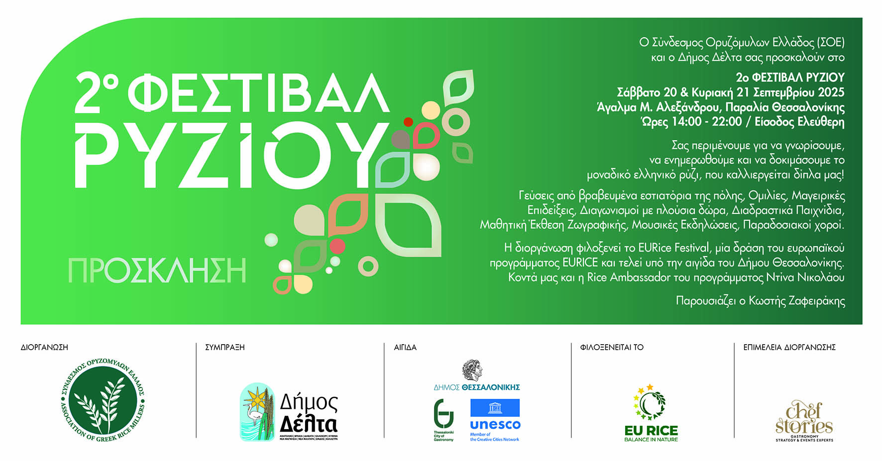 Το 2ο Φεστιβάλ Ρυζιού έρχεται για δεύτερη συνεχή χρονιά στις 20 και 21 Σεπτεμβρίου, στην Παραλία Θεσσαλονίκης.  Η πετυχημένη περσινή διοργάνωση, εμπλουτισμένη με ακόμη περισσότερες δράσεις και εκπλήξεις έρχεται για να μας ξανασυστήσει το ελληνικό ρύζι που καλλιεργείται δίπλα μας.  Μια διοργάνωση-γιορτή του Συνδέσμου Ορυζόμυλων Ελλάδος (ΣΟΕ), με την σύμπραξη του Δήμου Δέλτα και την αιγίδα του Δήμου Θεσσαλονίκης, για το νόστιμο, ασφαλές και με υψηλή διατροφική αξία ελληνικό ρύζι.