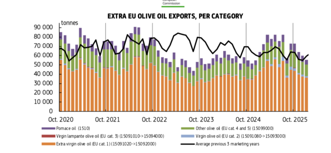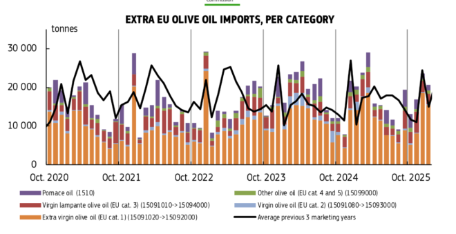 Αφού παρουσιάσαμε την  ισορροπία μεταξύ προσφοράς ζήτησης στην αγορά ελαιολάδου  και ΤΙΜΕΣ ΕΕ  τώρα θα εξετάσουμε τα φρέσκα στατιστικά στοιχεία της Κομισιόν για το διεθνές εμπόριο (εξαγωγές και εισαγωγές) ελαιολάδων και πυρηνελαίων τους τέσσερις πρώτους μήνες της εμπορικής περιόδου 2025/26 (Οκτ 2025-Ιαν. 2026).