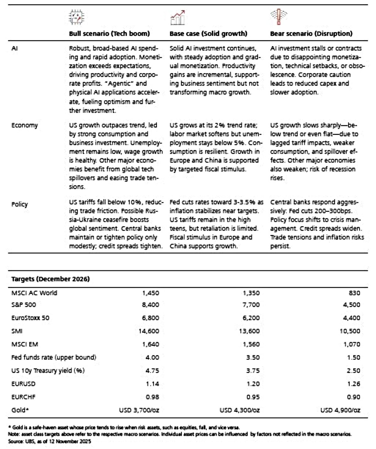 Ο Mark Haefele, Διευθυντής Επενδύσεων της UBS GWM, δηλώνει σχετικά: «Καθώς κοιτάμε προς το 2026, το ερώτημα είναι κατά πόσον οι ισχυρές δυνάμεις της Τεχνητής Νοημοσύνης, της δημοσιονομικής τόνωσης και της χαλάρωσης της νομισματικής πολιτικής είναι ικανές να ωθήσουν τις παγκόσμιες αγορές -πέρα ​​από τη σοβαρότητα του χρέους, των δημογραφικών στοιχείων και της απο-παγκοσμιοποίησης- προς μια νέα εποχή ανάπτυξης. Ο δρόμος εν μέσω των διαρθρωτικών αυτών αλλαγών απαιτεί από τους επενδυτές να προσαρμόσουν τις στρατηγικές τους, εστιάζοντας σε τομείς και θέματα όπου ρέει κεφάλαιο και λαμβάνει χώρα μετασχηματισμός».
